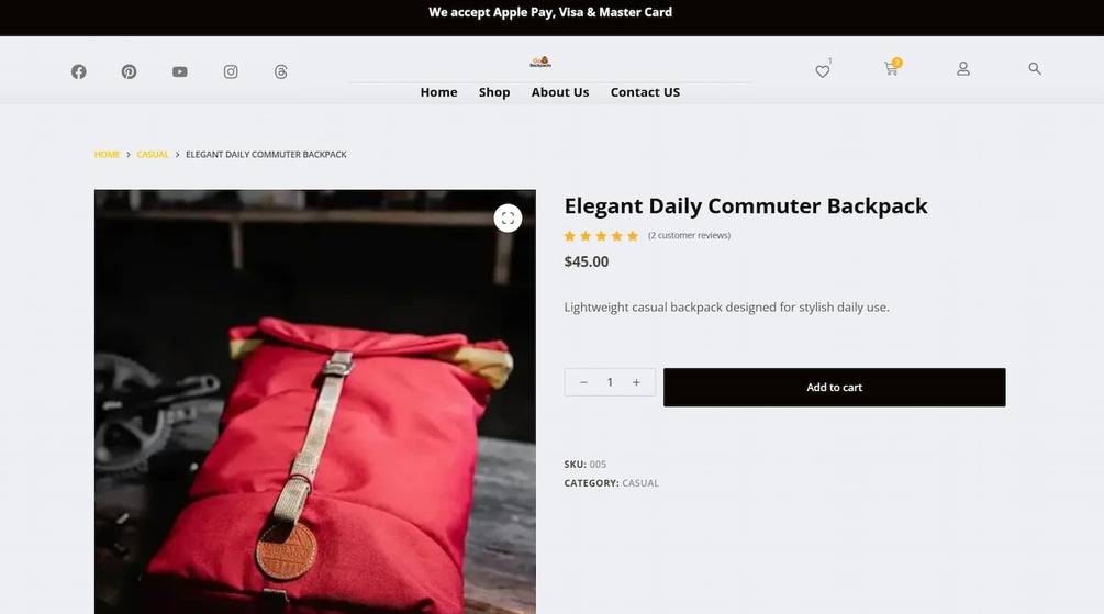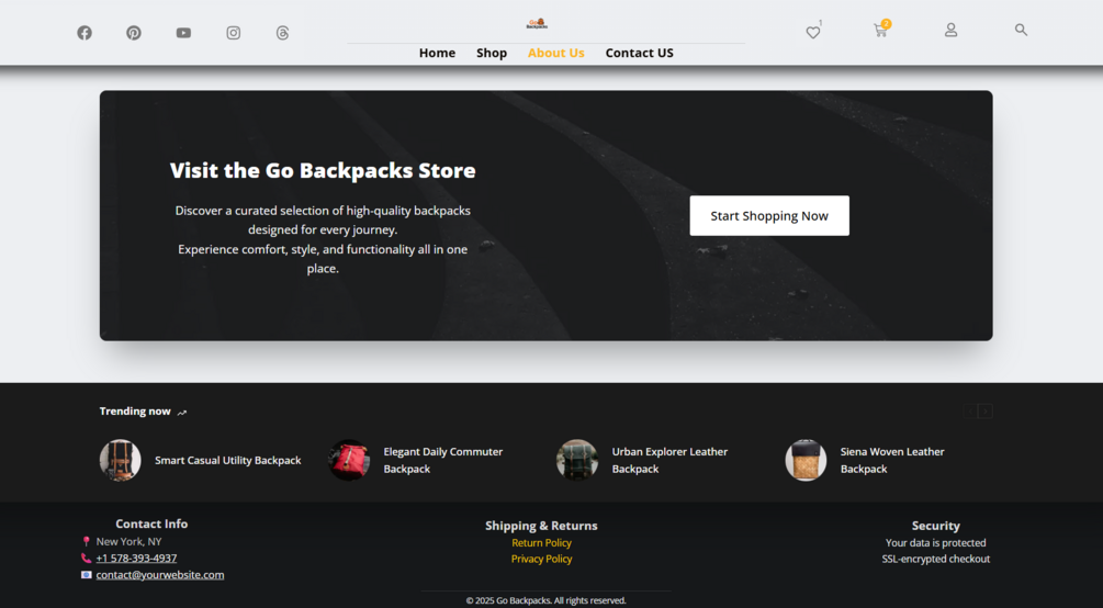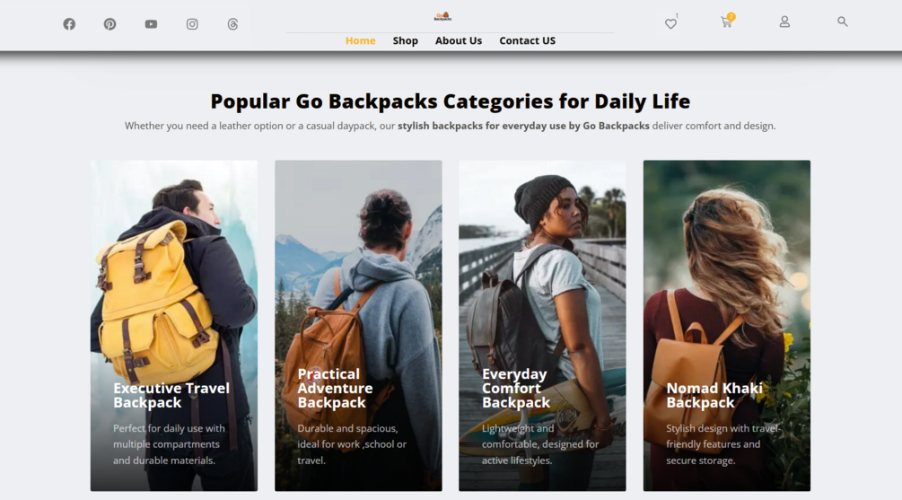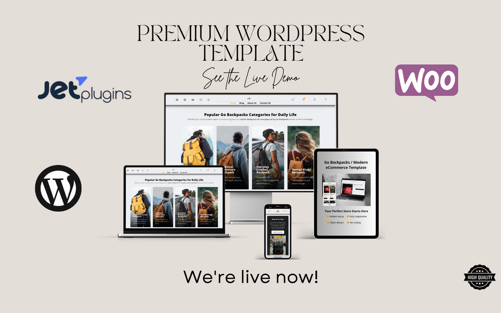 Go Backpacks is a professionally designed WordPress eCommerce template, perfect for online stores in the fashion, accessories, or backpack niches. Built with Elementor Pro, JetPlugins (JetCompareWishlist, JetPopup, JetSmartFilters), and the lightweight Blocksy theme, it delivers powerful functionality and a clean, modern layout.