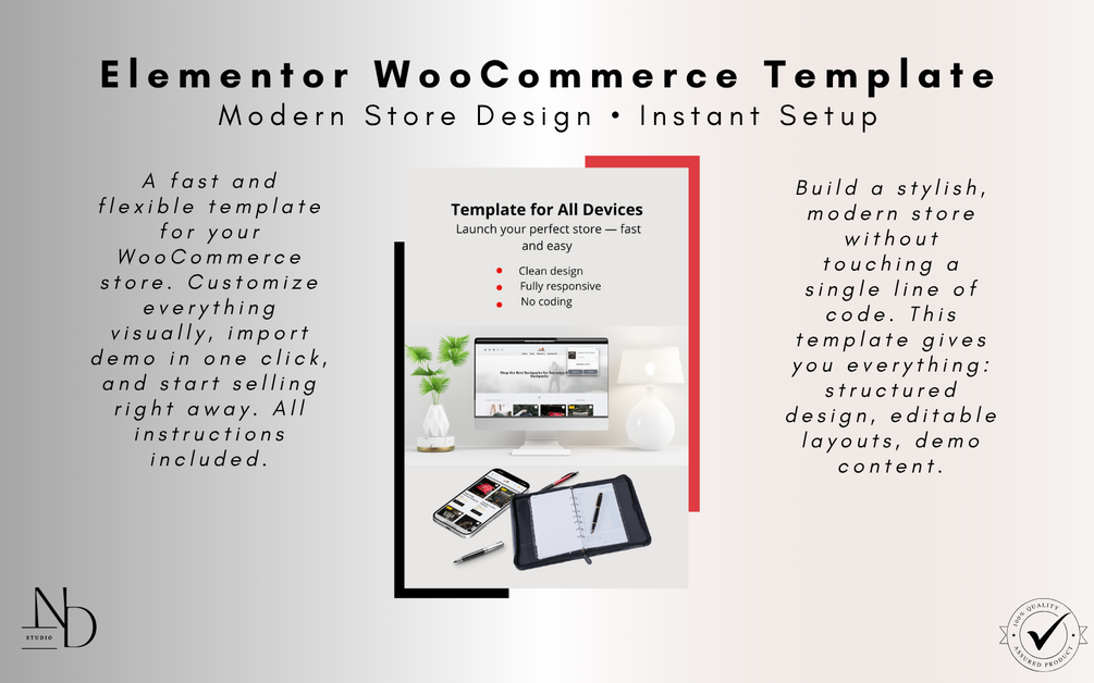 Elementor-based WordPress template with wishlist, filters, and cart — no coding needed.